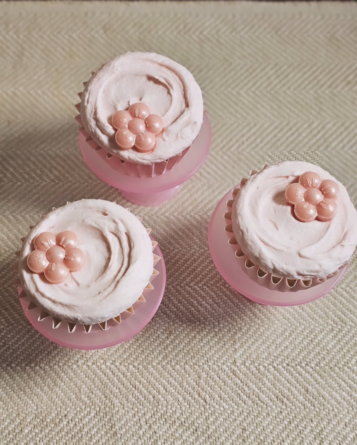 《Vanilla bean cupcakes filled with a whipped strawberry cream and vanilla buttercream frosting.》